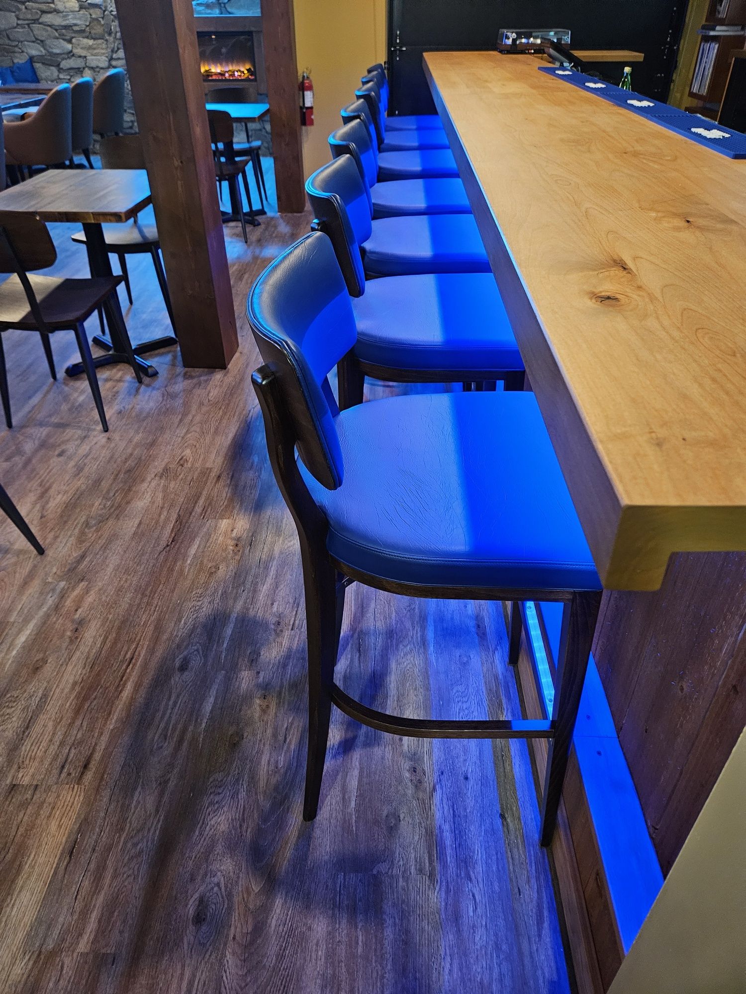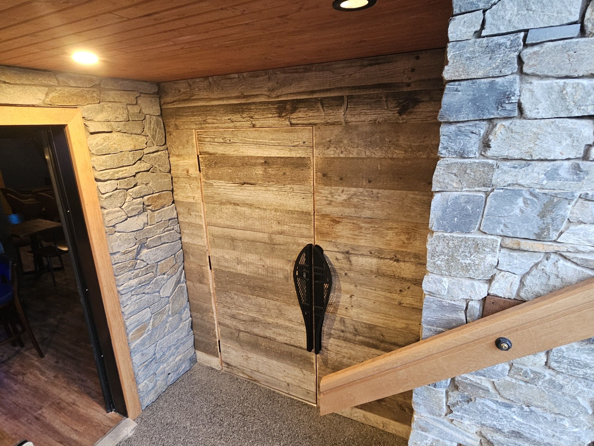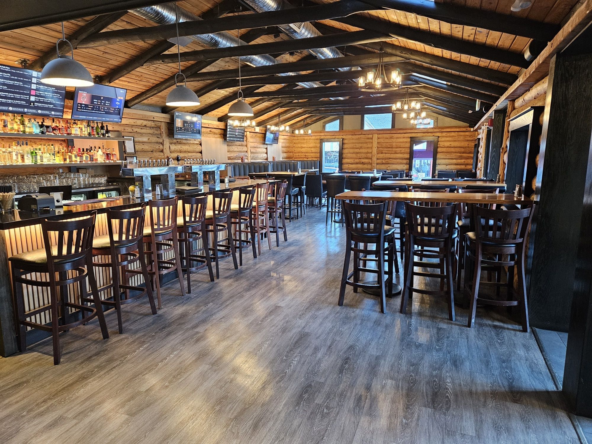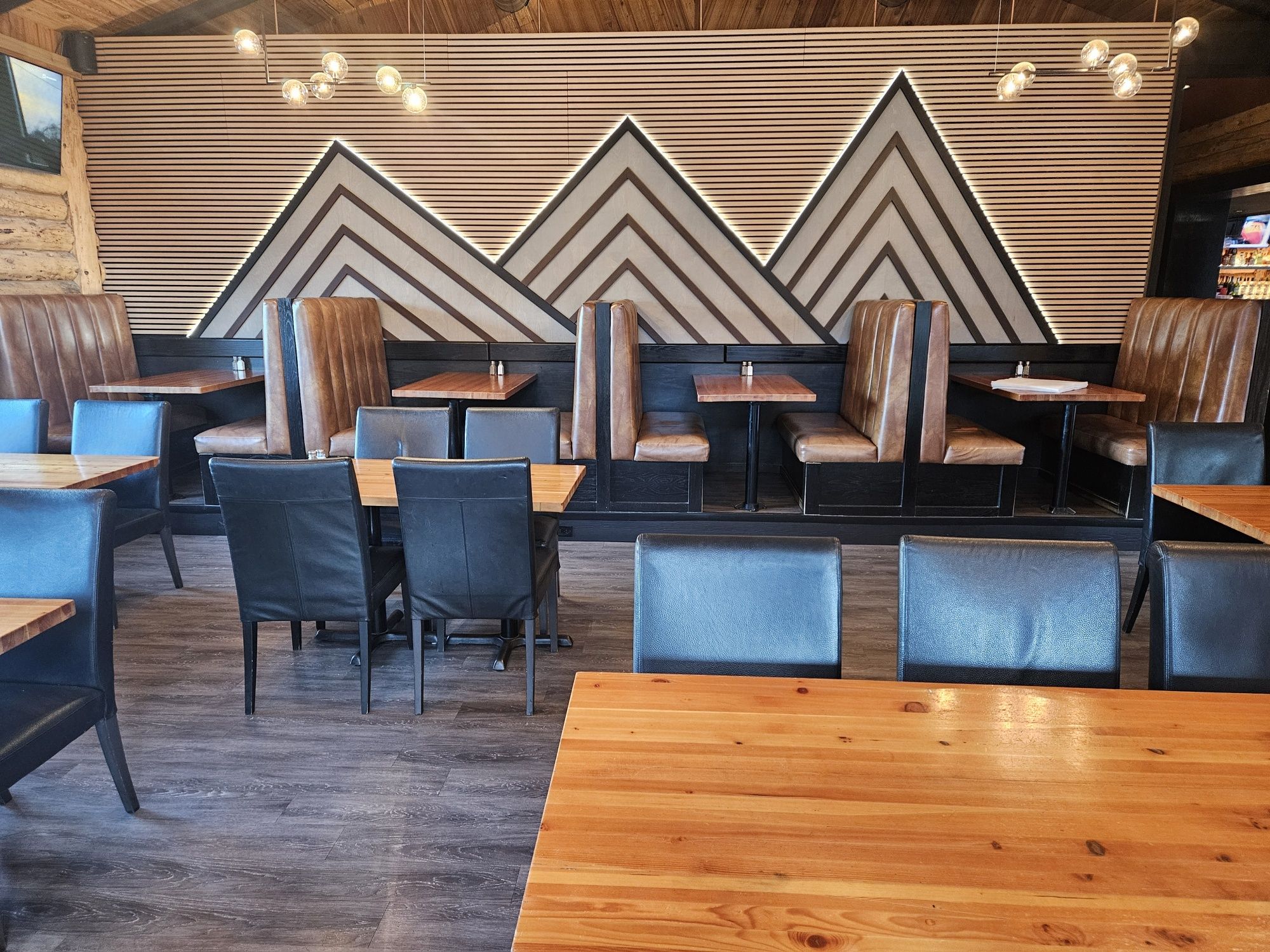 Our main street lounge offers rustic log walls, vaulted ceilings, a 12 seat full service bar, booth, table and high-top seating. The room opens up onto the best patio in town and shares mountain views all around. Video screens throughout the room can show in house content or content catered to your group.
