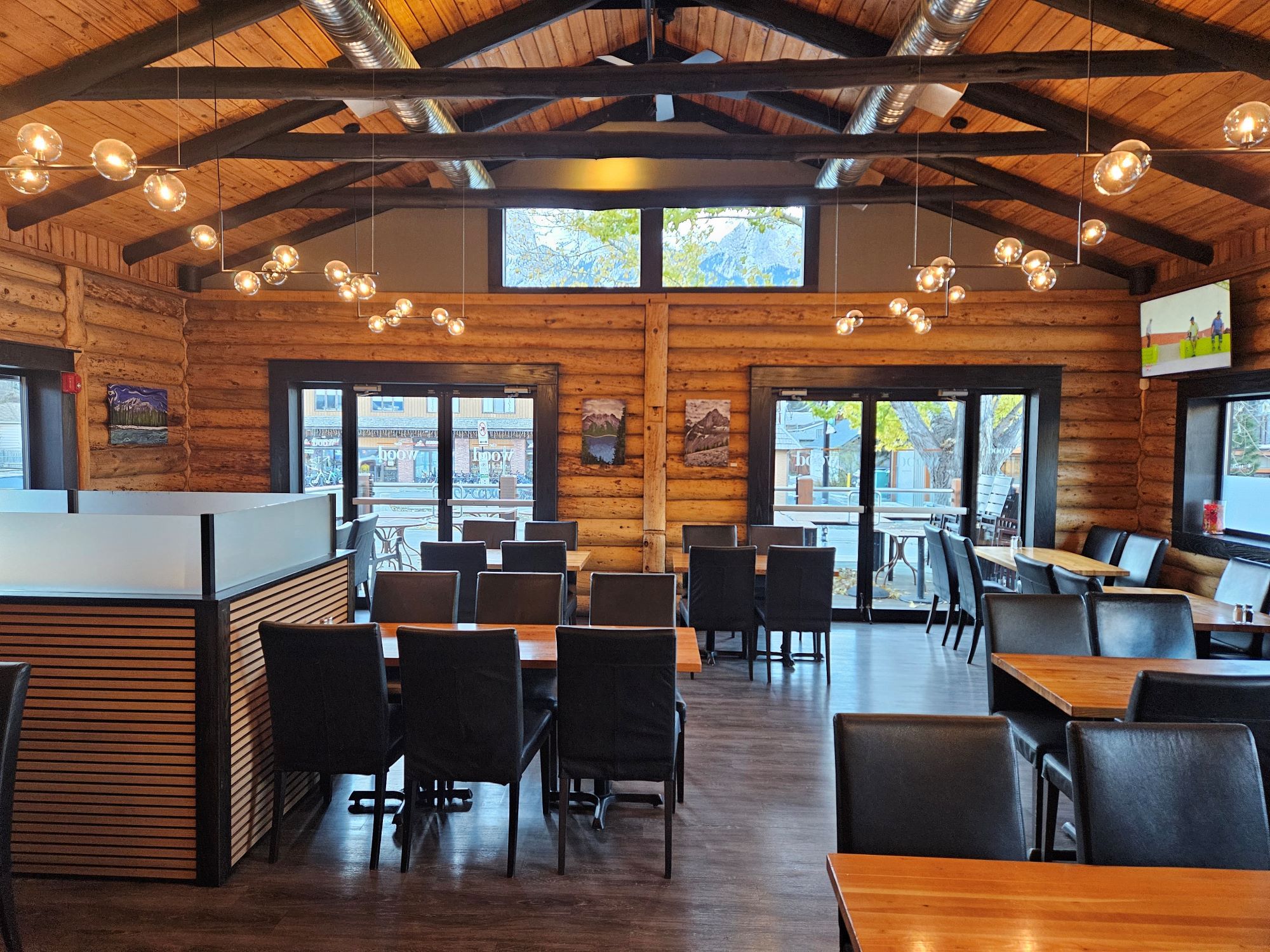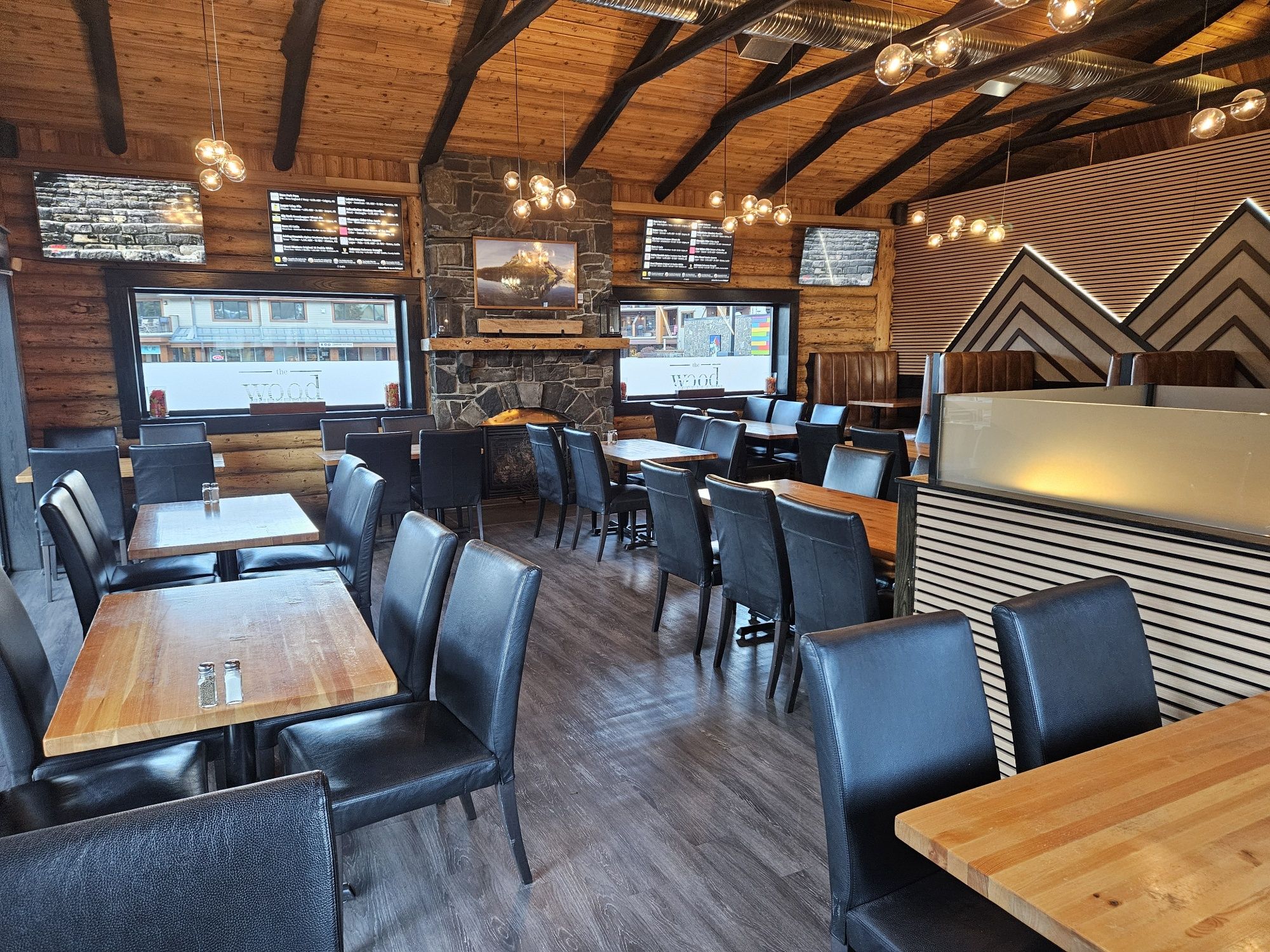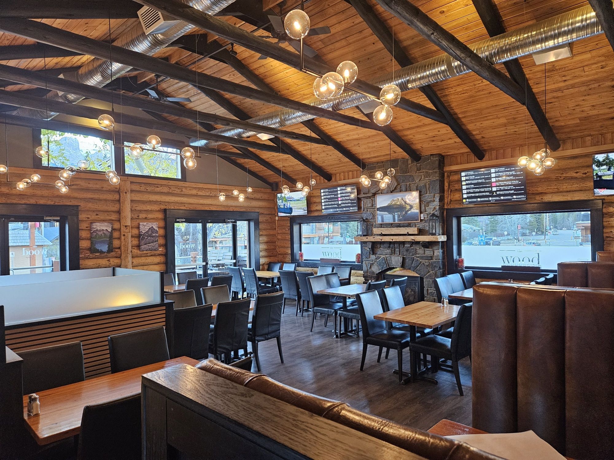 Located on Canmore's premeire corner, The Wood Restaurant has become an iconic destination in Canmore. The restaurant is in a rustic log building featuring a massive patio, both with majestic views of the local mountain ranges. A stone fireplace, vaulted ceilings and plenty of windows to take in the amazing views make the Wood a favourite spot for locals and visitors alike.